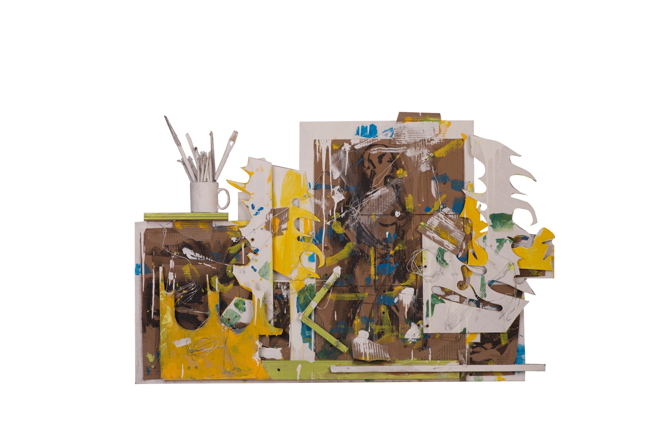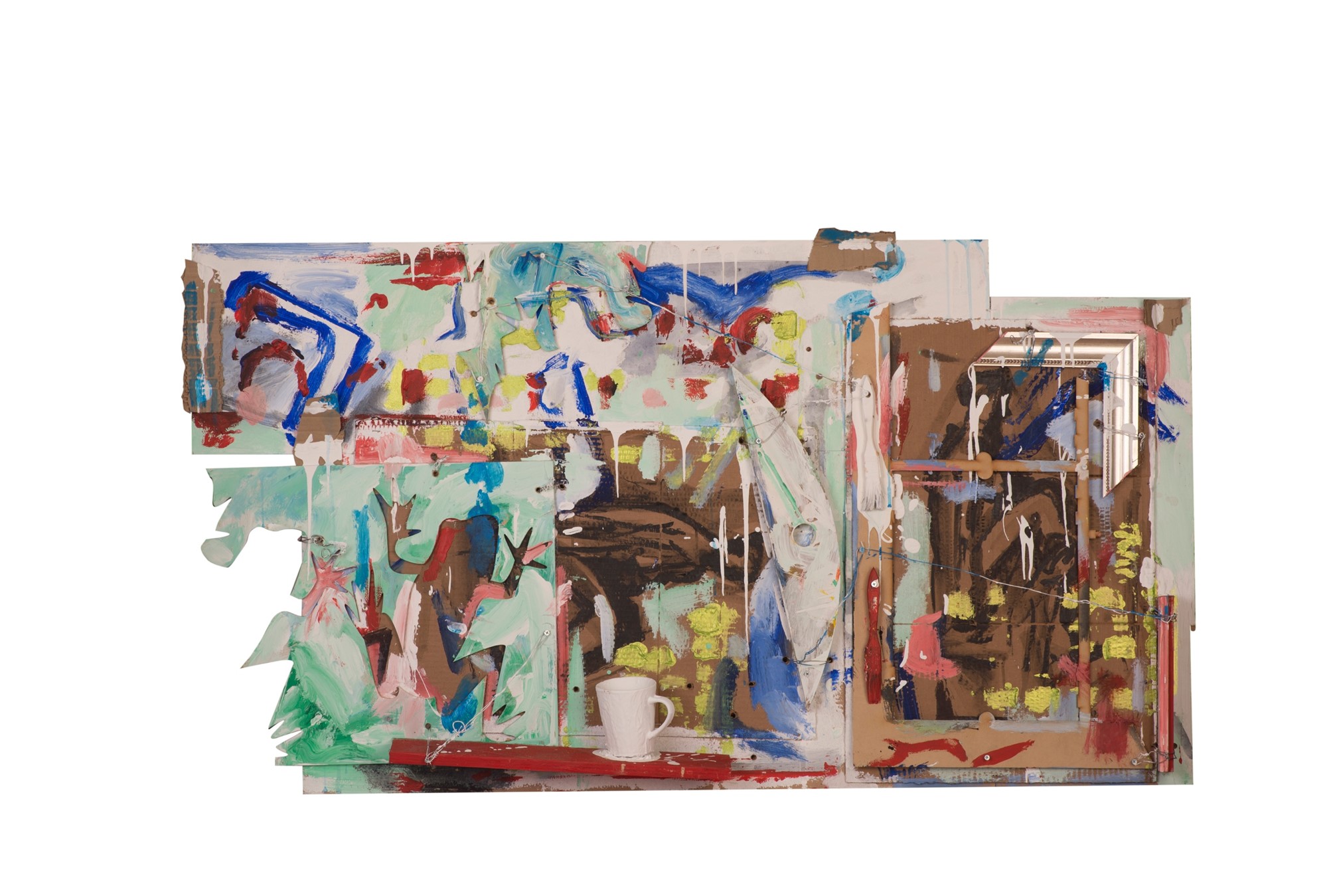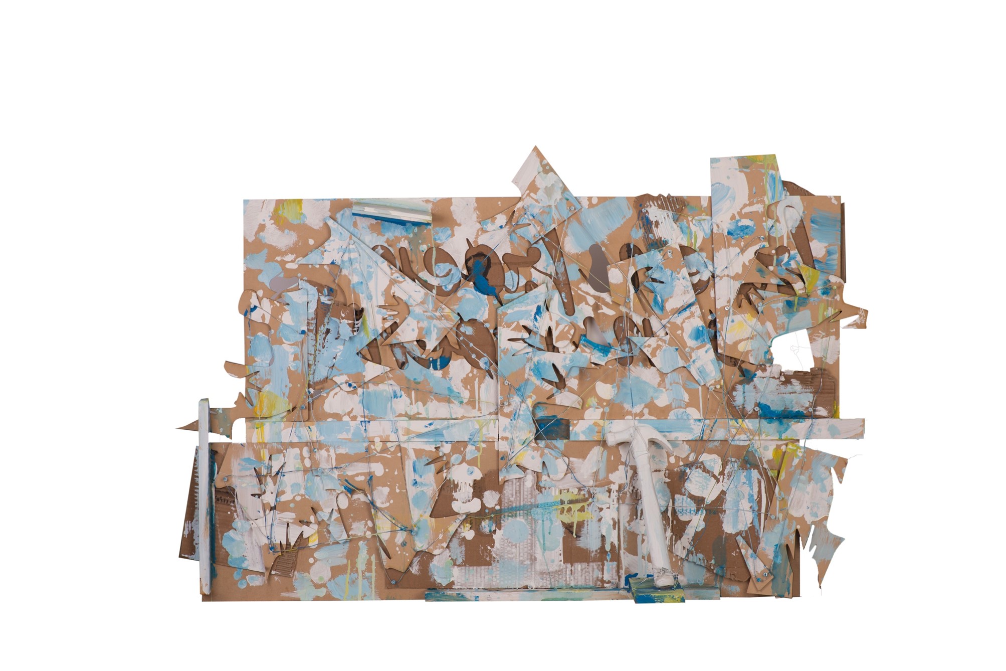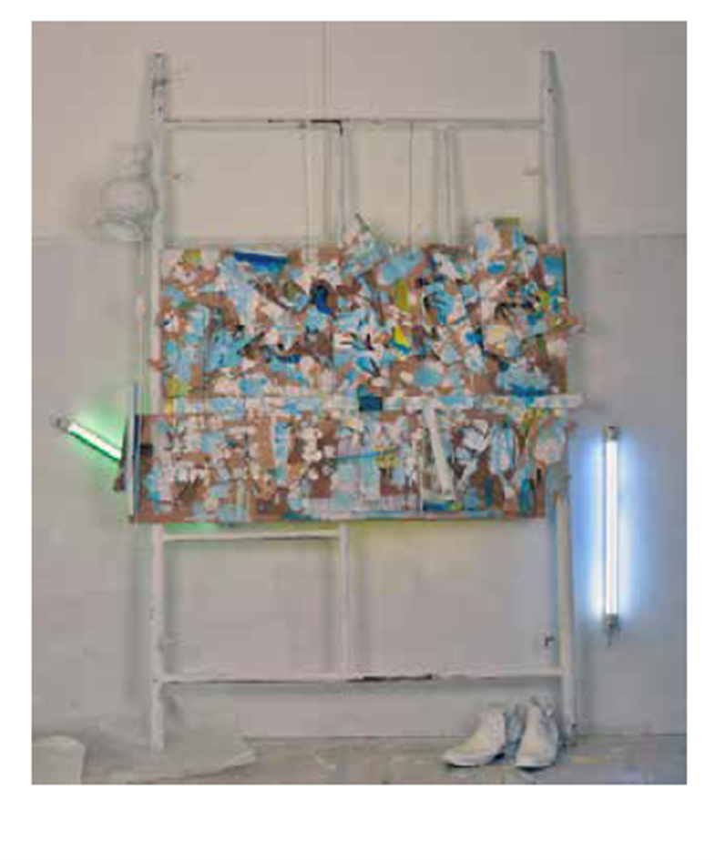 Obras instalación en andamios, Maderas recicladas corte láser, objetos encontrados, luz fluorescente, Latex blanco